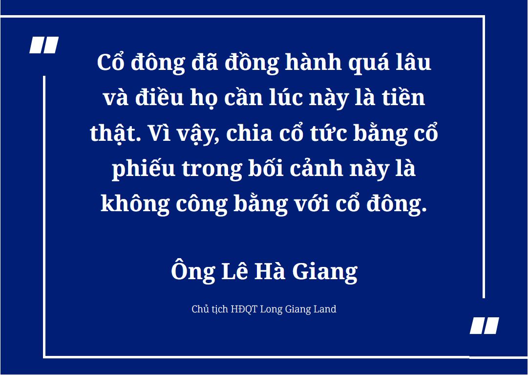 “Có những cổ đông đã chờ đợi rất lâu mà chưa được hưởng thành quả tương xứng. Còn với cán bộ nhân viên, đó là lời hứa chưa thực hiện về môi trường làm việc tốt nhất ngành”, ông Lê Hà Giang, Chủ tịch HĐQT Long Giang Land, chia sẻ tại đại hội vừa diễn ra.