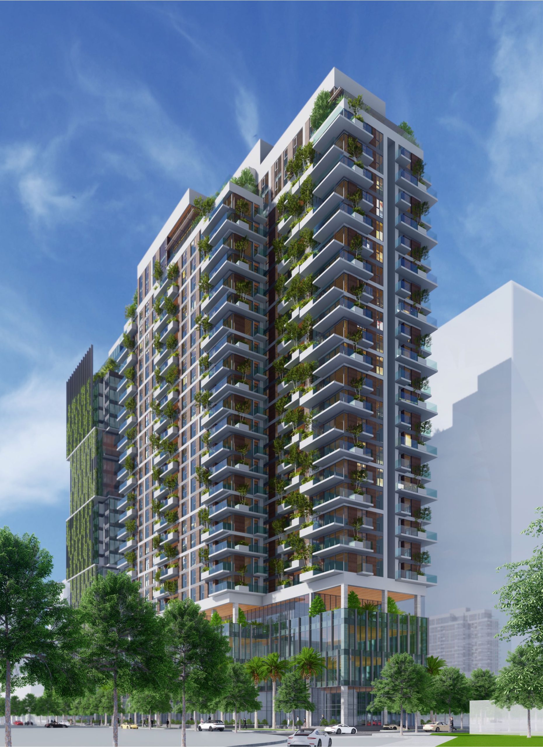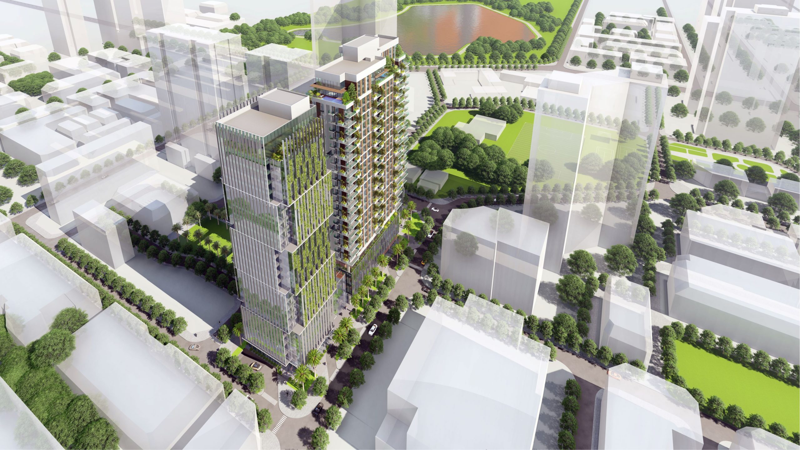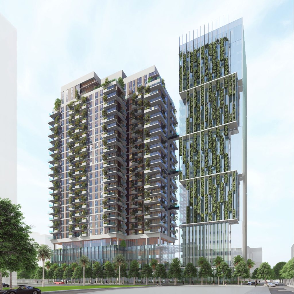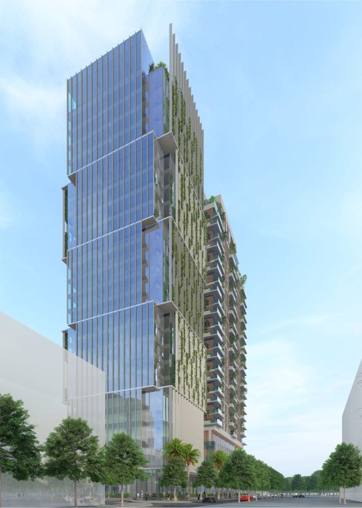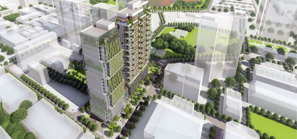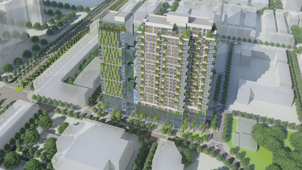 - Dự án gồm 01 tòa nhà hỗn hợp với 02 tháp cao 25 tầng, 29.600m2 diện tích sàn căn hộ, 23.000 m2 diện tích sàn thương mại dịch vụ, văn phòng, 04 tầng hầm
